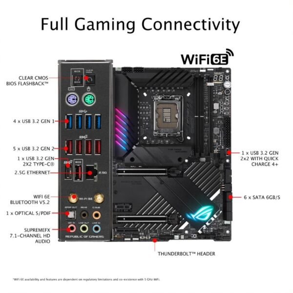 | Audio | ROG SupremeFX 7.1 Surround Sound High Definition Audio CODEC ALC4080 – Impedance sense for front and rear headphone outputs – Supports: Jack-detection, Multi-streaming, Front Panel Jack-retasking – High quality 120 dB SNR stereo playback output and 113 dB SNR recording input – Supports up to 32-Bit/384 kHz playback |