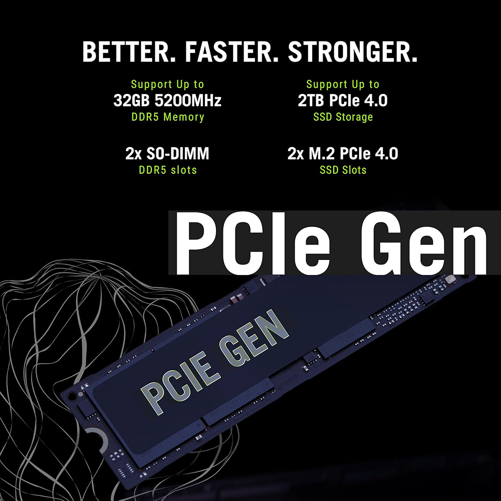 • Memory: 16GB DDR5-5200 SO-DIMM RAM expandable up to 64GB using 2x SO-DIMM slots