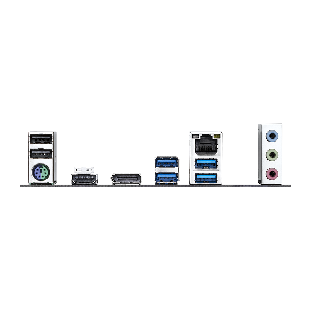 | Back Panel I/O Ports | 2 x USB 2.0/1.1 ports 1 x PS/2 keyboard/mouse port 1 x HDMI port (Note) 1 x DisplayPort (Note) 4 x USB 3.2 Gen 1 ports 1 x RJ-45 port 3 x audio jacks |