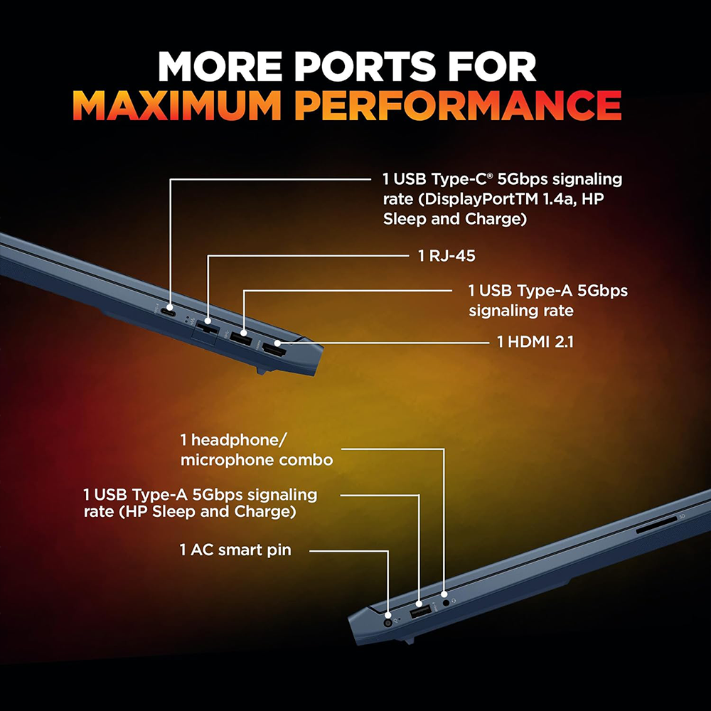 Ports & Connectivity : 1 USB Type-A 5Gbps signaling rate (HP Sleep and Charge); 1 USB Type-A 5Gbps signaling rate; 1 AC smart pin; 1 HDMI-out 2.1; 1 headphone/microphone combo; 1 RJ-45; 1 USB Type-C 5Gbps signaling rate (USB Power Delivery 3.1, DisplayPort 1.4a, HP Sleep and Charge)| Wireless: Realtek Wi-Fi 6 (2×2) and Bluetooth 5.4 wireless card|
